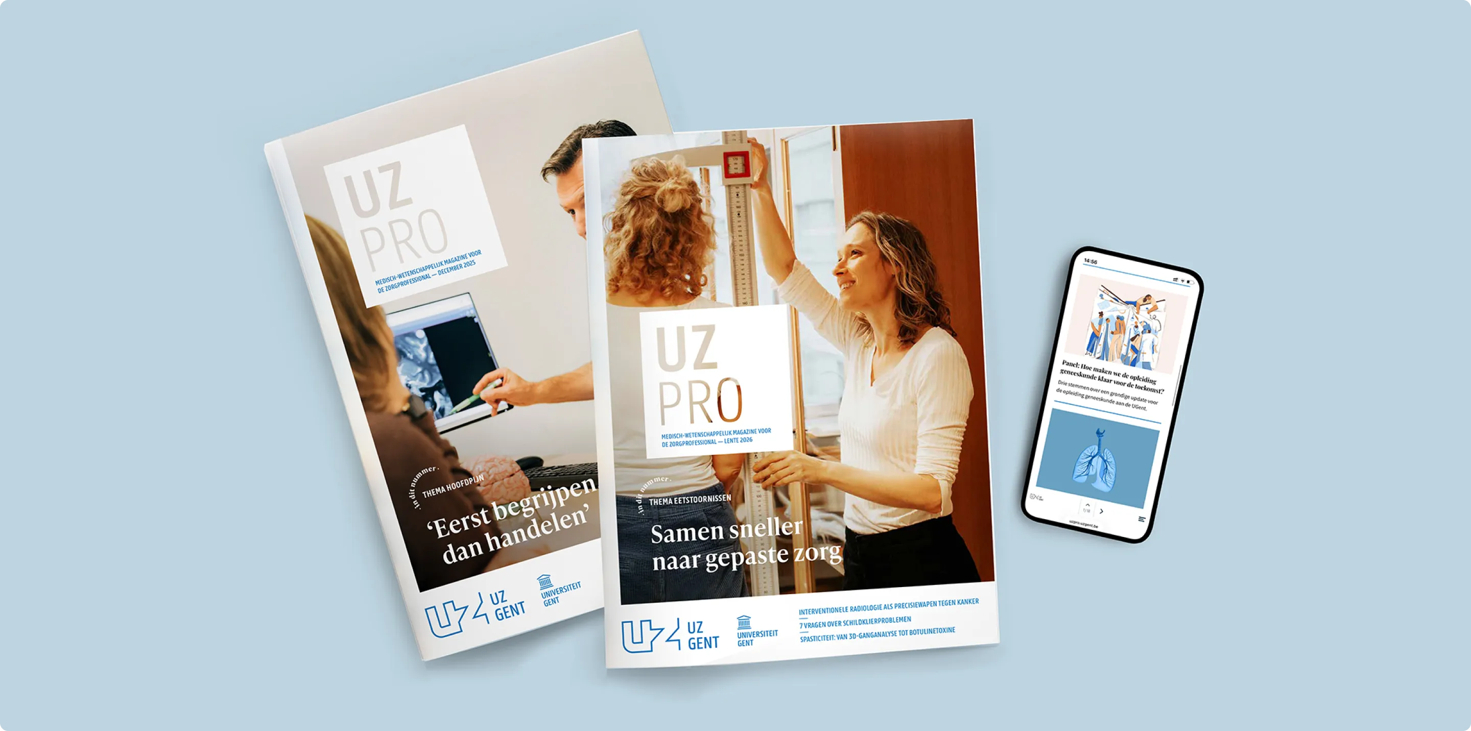 Van complexe medische gidsen tot toegankelijke verhalen. Van strategisch advies tot visuele formats, in print en digitaal, op maat van verwijzers, zorgverleners, beleidsmakers én patiënten. Een van de speerpunten van onze samenwerking is UZ Pro: het vakblad dat artsen – op papier en online – informeert, verbindt en inspireert.